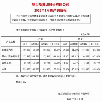 近日,鸿蒙智行与赛力斯公布的问界系列销量数据出现差异,引发市场关注。2月1日,鸿蒙智行宣布2025年1月问界M9系列交付12483辆,问界新M7系列交付8443辆 ;而2月4日赛力斯发布的产销快报显示,1月销量为17906辆,同比下滑51.39%,两者数据相差数千辆。